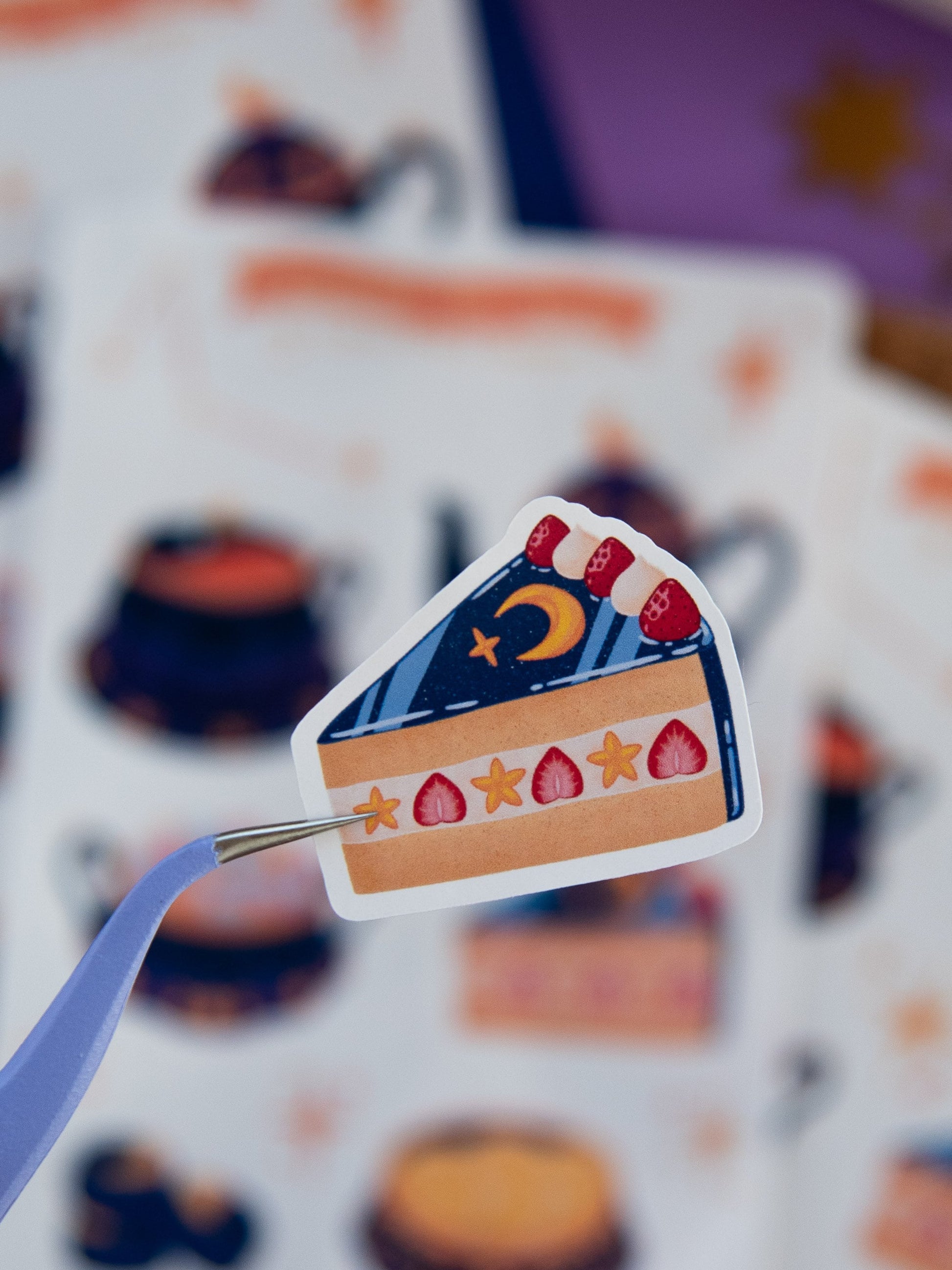 This cute moon and stars-themed sticker sheet features original designs of a tea party complete with pastries and sweet conpeito! Care for a cup?