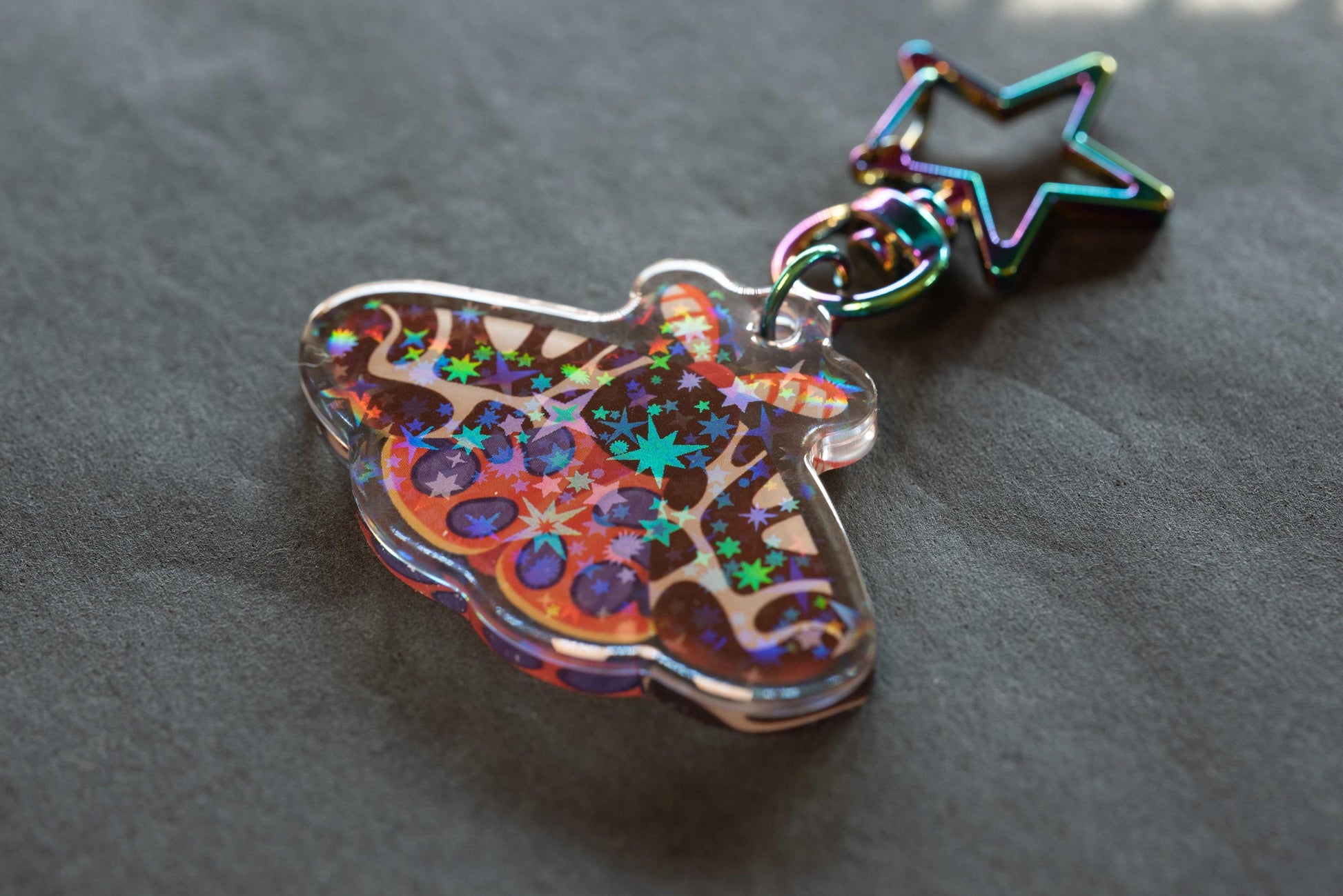 This gorgeous moth design is part of a collection of moth illustrations that have taken form of stickers as well as keychains. Let joy be sparked with each shimmer of the star holo!