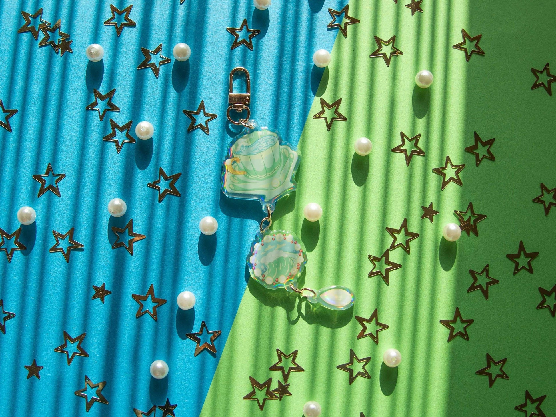 Dive into the beauty of the ocean with this beautiful keychain. It depicts some of the motifs of my Mermaid Tea Party sticker sheet! Show your love for the ocean and mermaids with this cute holo accessory!